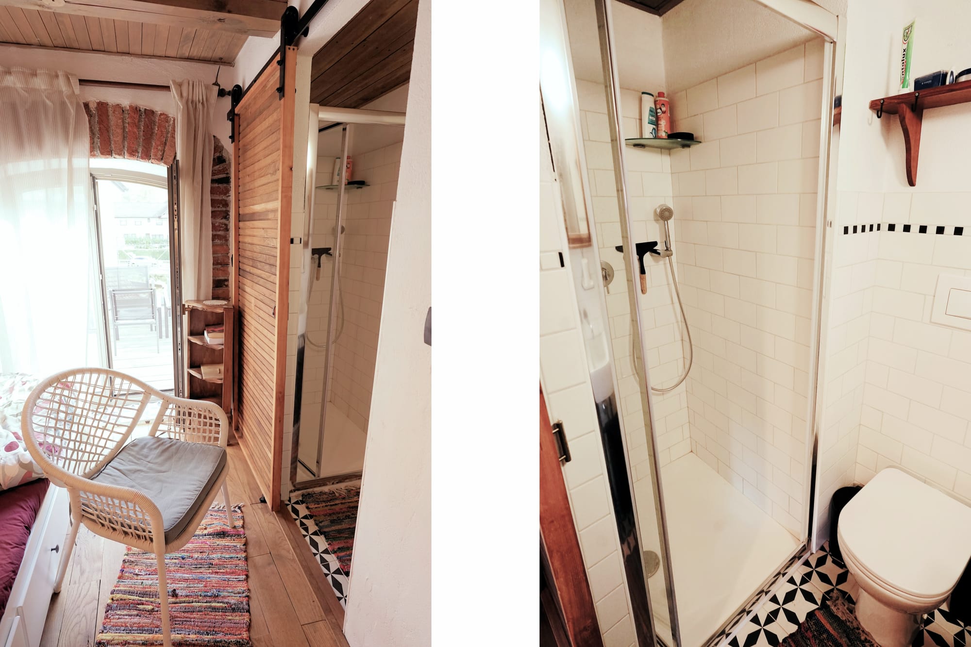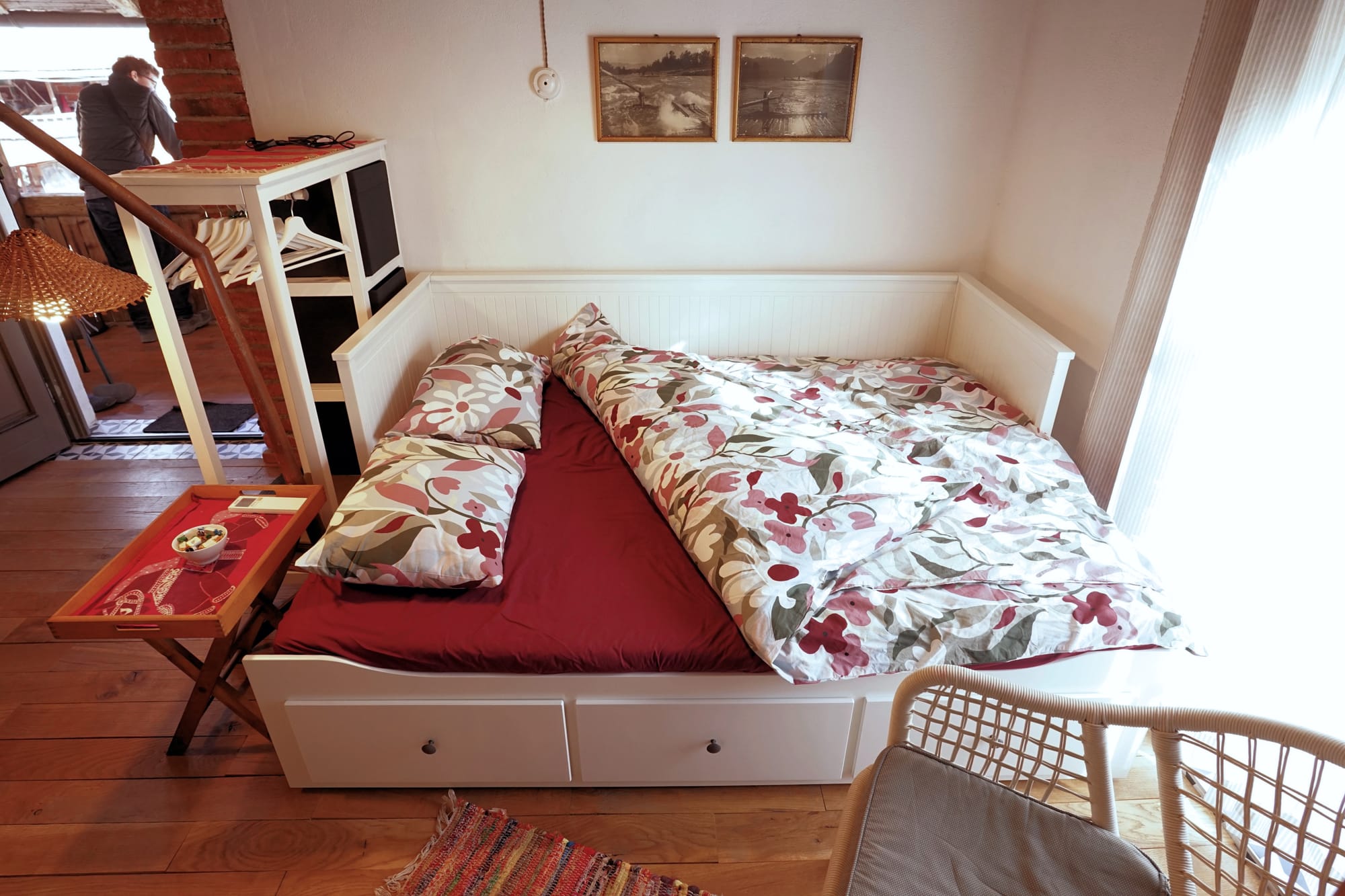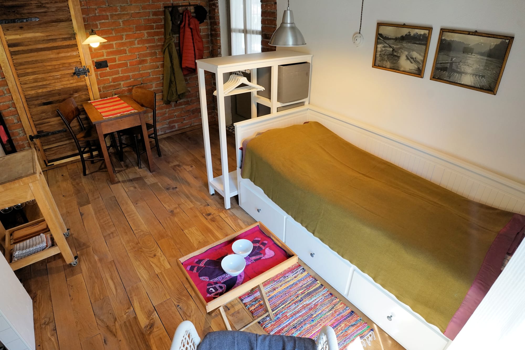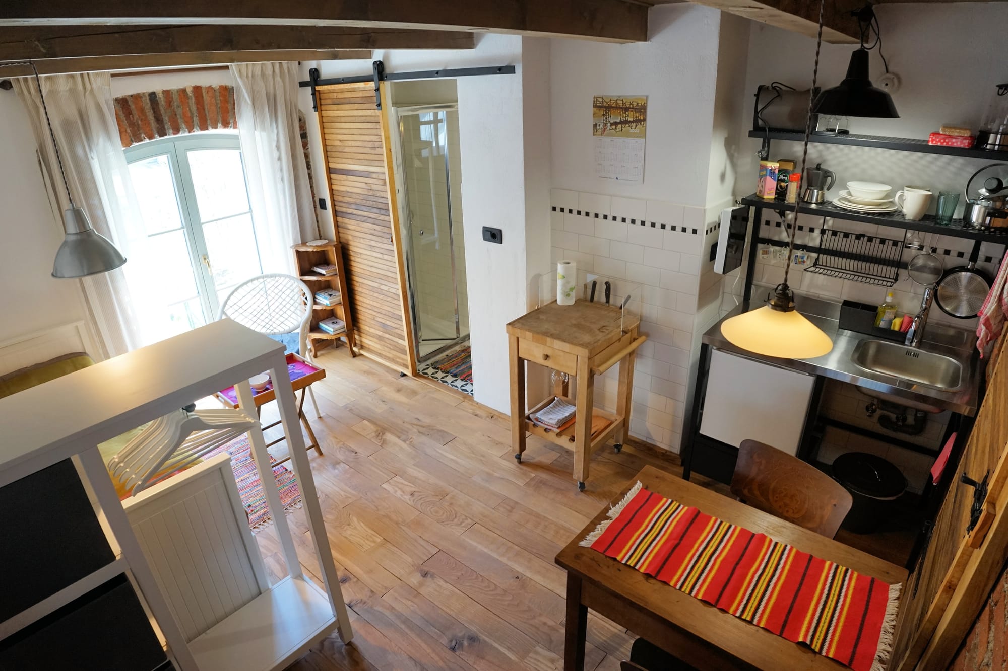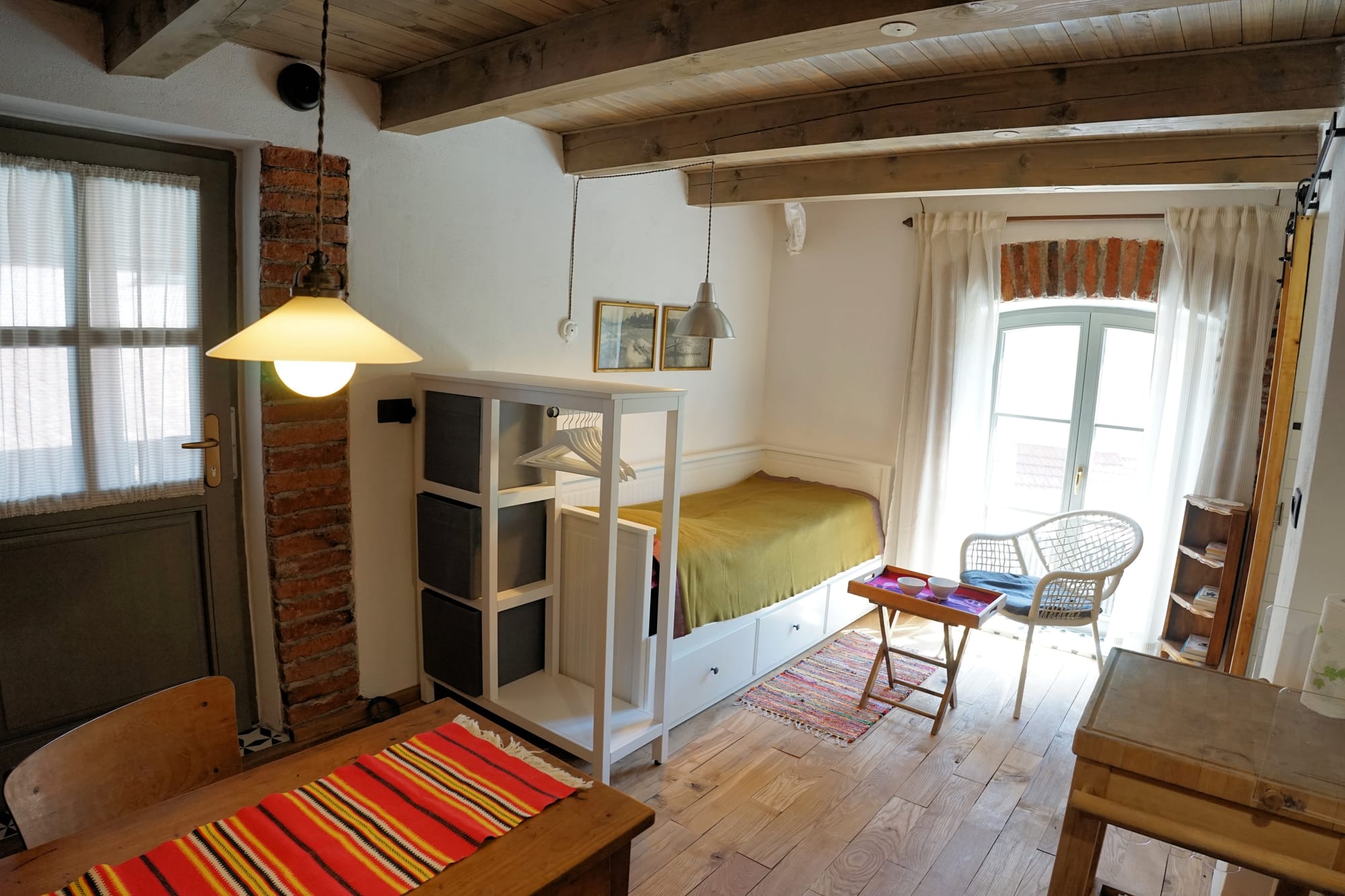 Mali studio ima vse, kar bosta popotnik ali par potrebovala za svoje bivanje in počitek po spoznavanju razgibane in zelene okolice Gornjega Grada. Mini kuhinja je dobro opremljena za pripravo in postrežbo obrokov. Za drsnimi vrati je skrita mala kopalnica s tušem. Udobno ležišče je raztegljivo (enojno ali dvojno), odprta omara za garderobo pa dovolj prostorna. Prostor je lahko ogrevan/hlajen. Vhodni senčni balkon in sončna terasa nad potokom pa bosta bivanje napravila še prijetnejše. The small studio has everything a traveler or couple will need for their stay and rest after exploring the vibrant and green surroundings of Gornji Grad. The mini kitchen is well equipped for preparing and serving meals. Behind the sliding doors is a small bathroom with a shower. The comfortable bed is extendable (single or double), and the open wardrobe is spacious enough. The space can be heated/cooled. The entrance shaded balcony and sun terrace above the stream will make your stay even more pleasant.