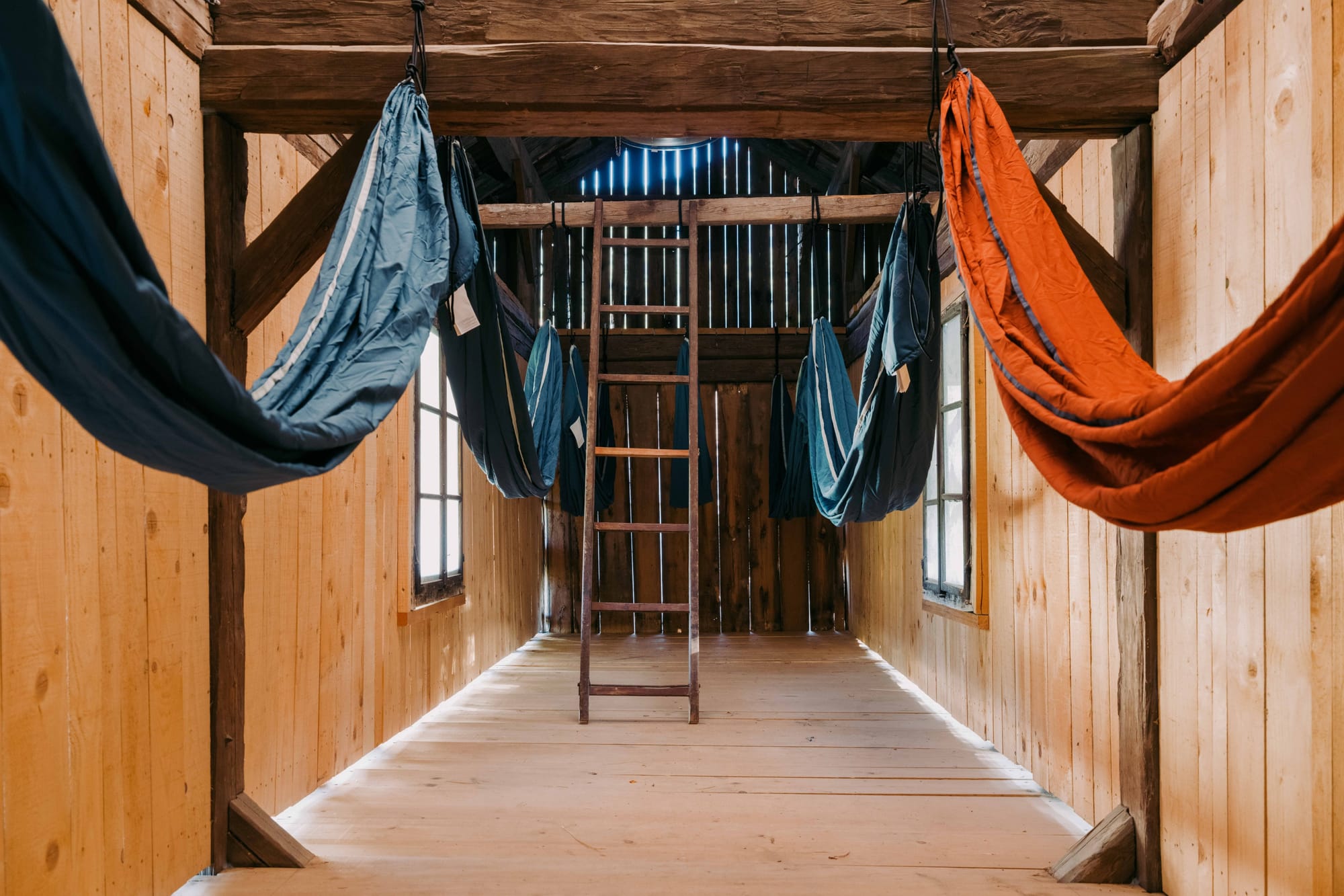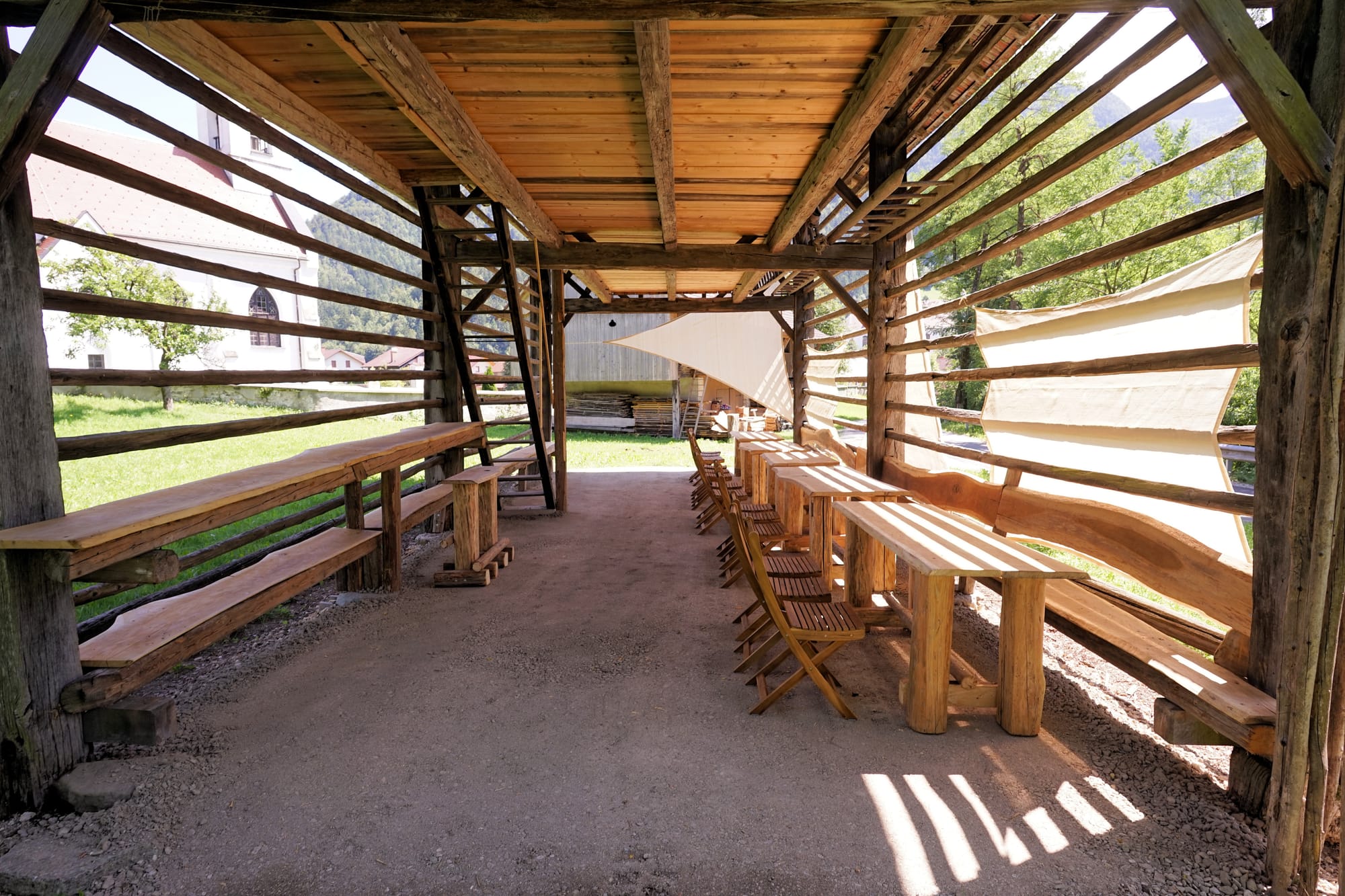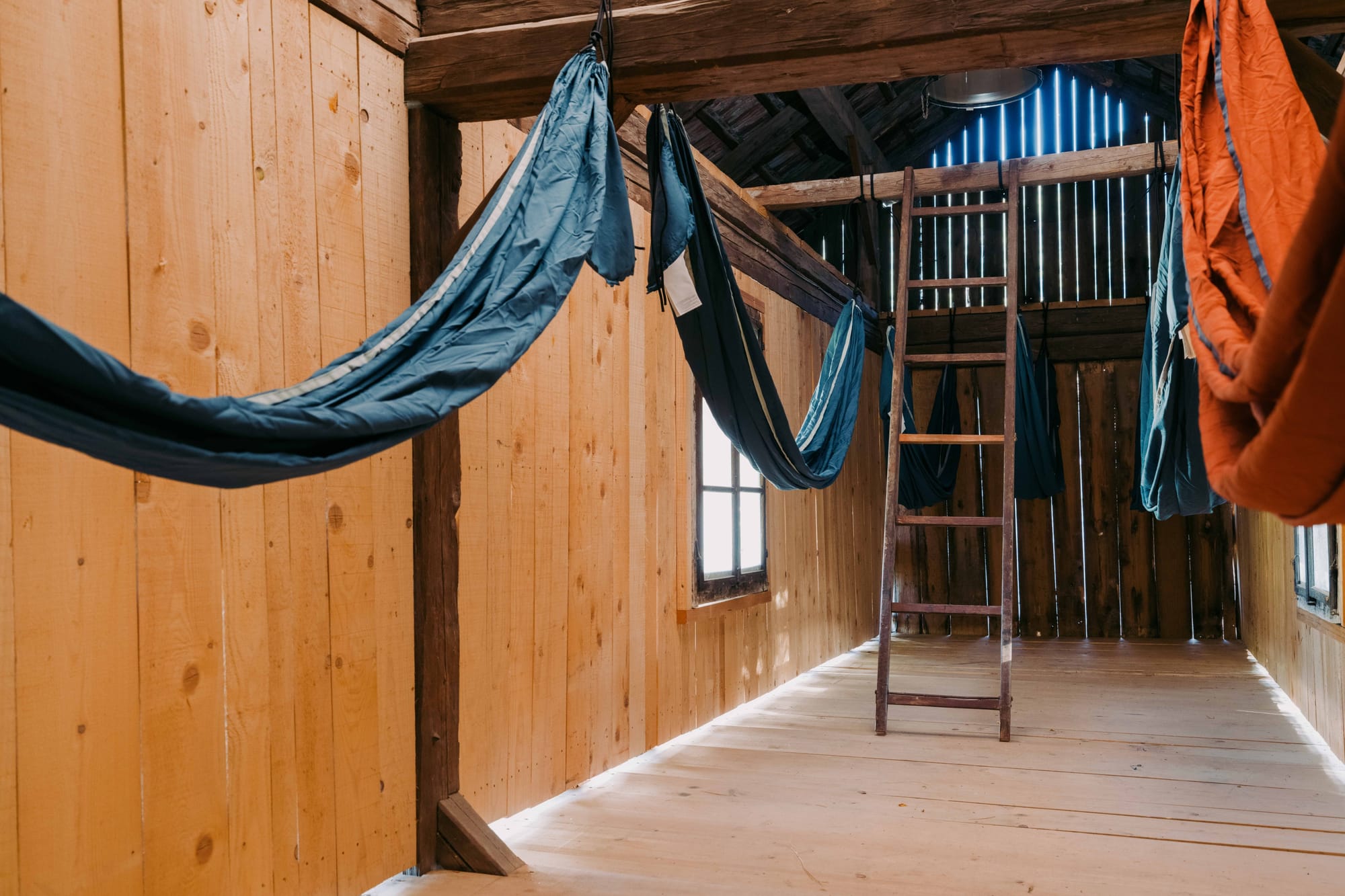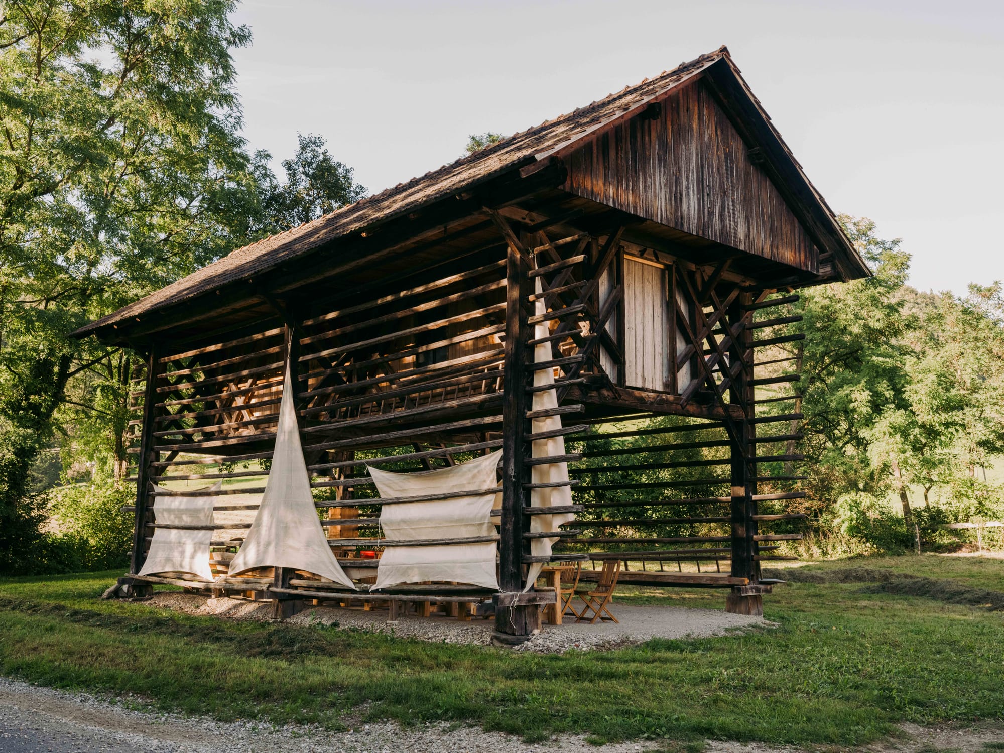 Pod streho dvojnega kozolca je prostor za počitek in prenočevanje popotnikov, ki peš ali s kolesi raziskujejo okolico ali pa jih pot samo zanese mimo. V prostoru je nameščenih 8 spalnih mrež in 4 omarice z zaklepom. Skupna kopalnica je v pritličju stavbe oddaljene 40 m. Pod kozolcem je prostor z mizami in klopmi ter žarom, kjer se popotniki tudi v zavetju pred soncem ali dežjem lahko odpočijejo in okrepčajo. Kozolec je na voljo tudi za dnevni najem za skupine do 30 ljudi za druženje na pikniku. Under the roof of the double hayloft is a place for travelers to rest and spend the night, exploring the area on foot or by bike, or just passing by. The space is equipped with 8 hammocks and 4 lockers with locks. The shared bathroom is located on the ground floor of the building, 40 m away. Under the hayloft is a space with tables and benches and a barbecue, where travelers can rest and prepare a meal, also in shelter from the sun or rain. The hayloft is also available for daily rental for groups of up to 30 people for a picnic.