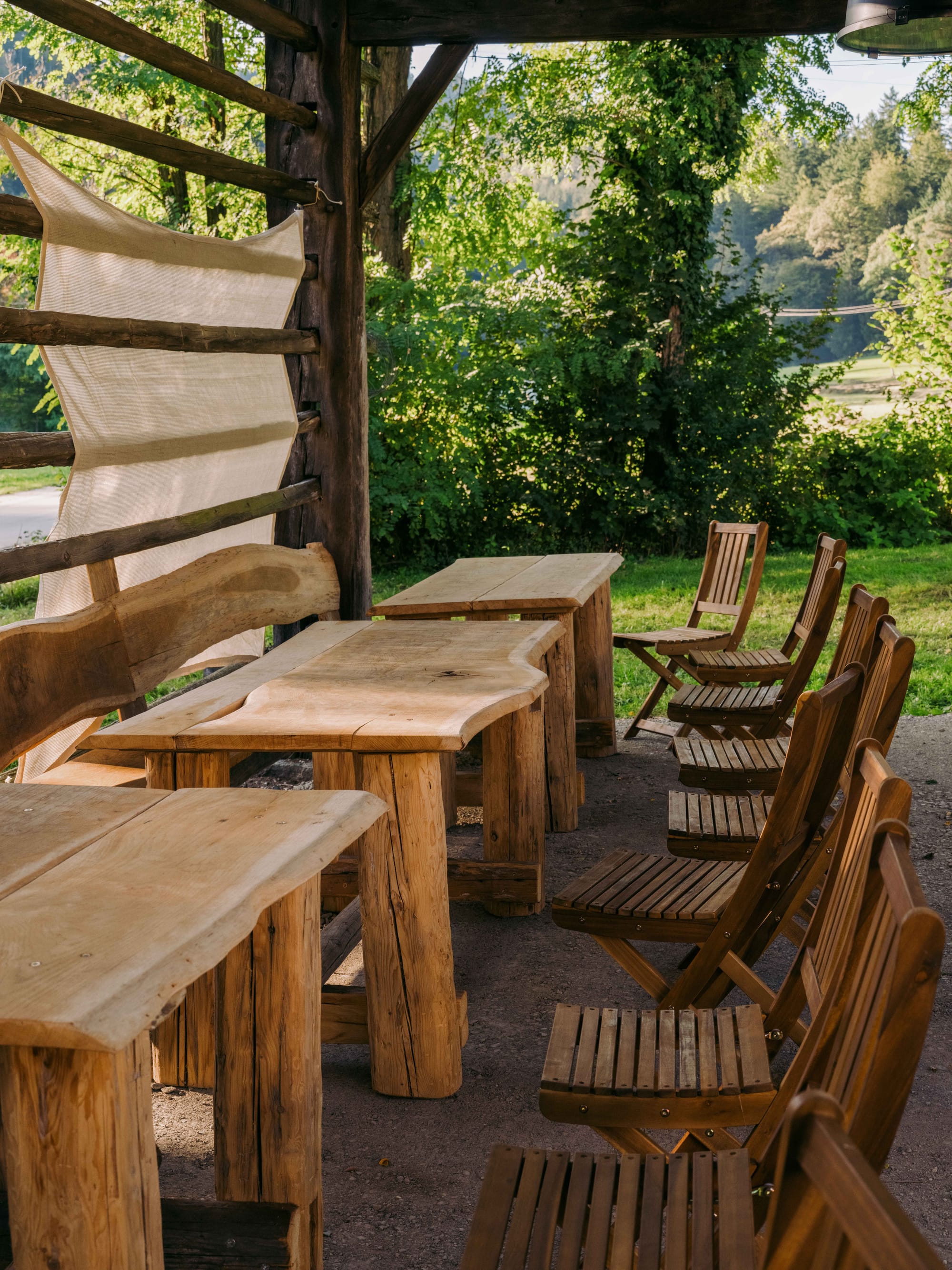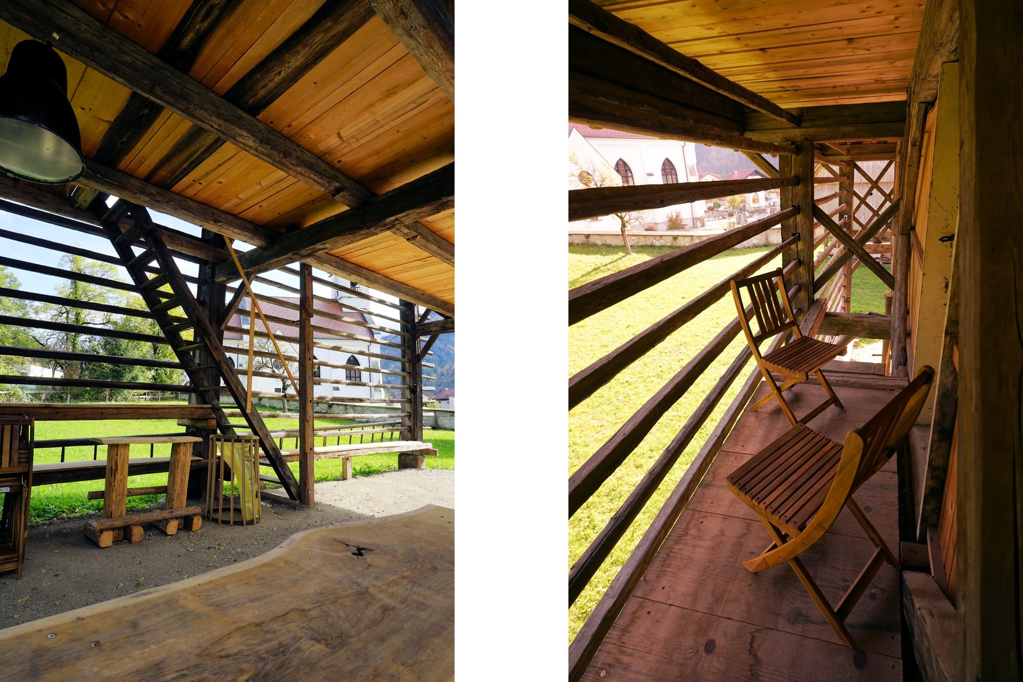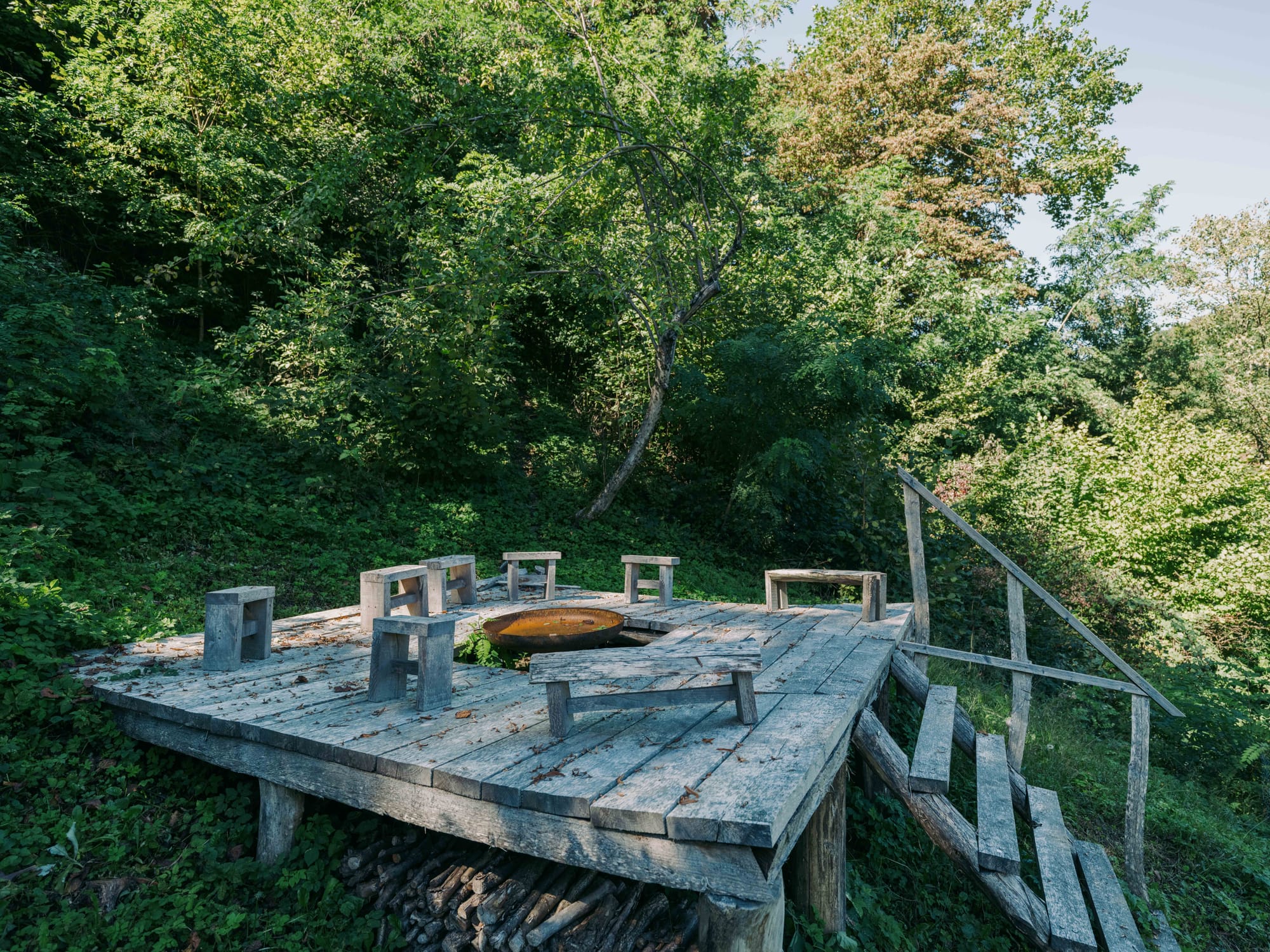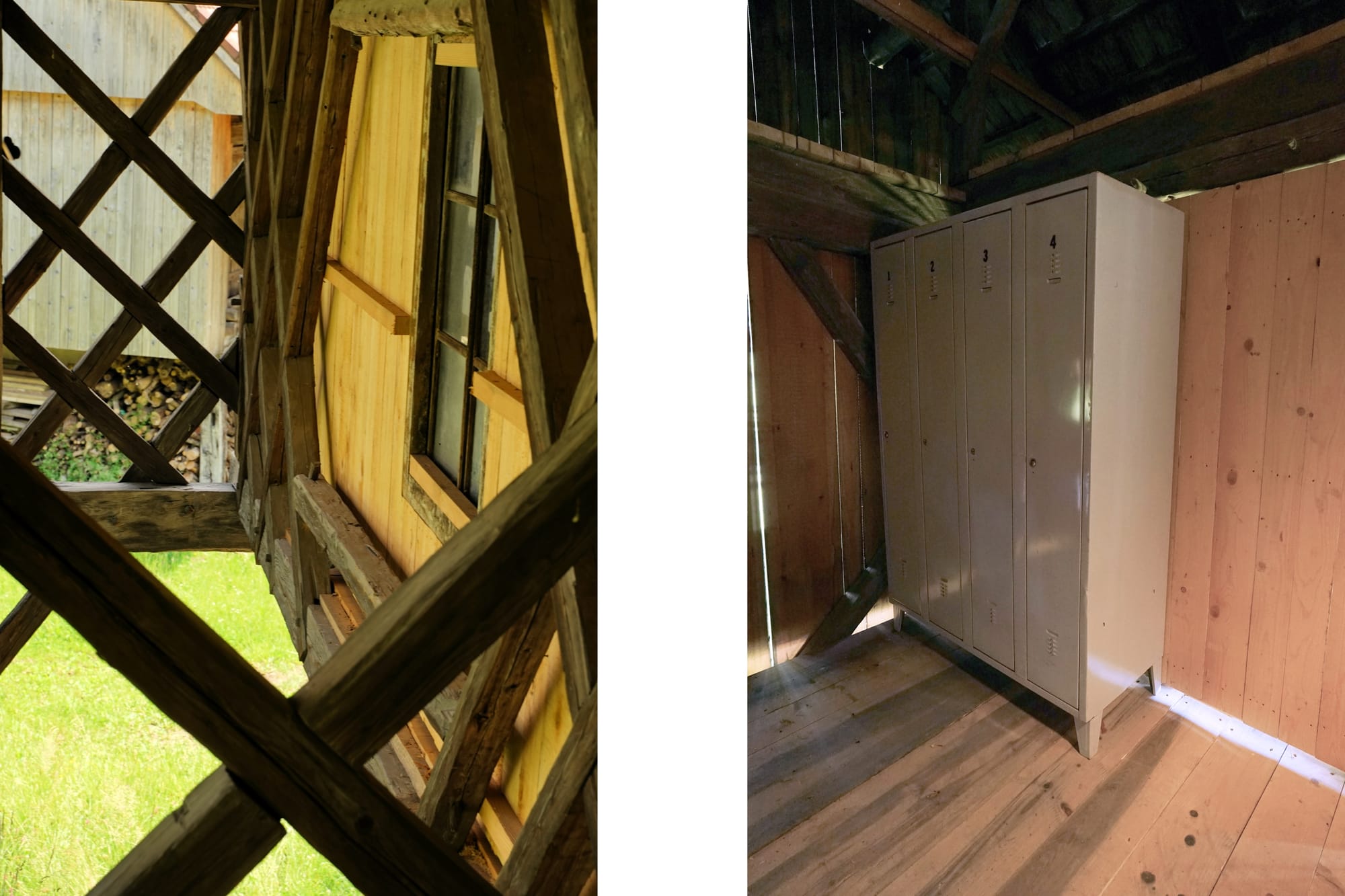 Pod streho dvojnega kozolca je prostor za počitek in prenočevanje popotnikov, ki peš ali s kolesi raziskujejo okolico ali pa jih pot samo zanese mimo. V prostoru je nameščenih 8 spalnih mrež in 4 omarice z zaklepom. Skupna kopalnica je v pritličju stavbe oddaljene 40 m. Pod kozolcem je prostor z mizami in klopmi ter žarom, kjer se popotniki tudi v zavetju pred soncem ali dežjem lahko odpočijejo in okrepčajo. Kozolec je na voljo tudi za dnevni najem za skupine do 30 ljudi za druženje na pikniku. Under the roof of the double hayloft is a place for travelers to rest and spend the night, exploring the area on foot or by bike, or just passing by. The space is equipped with 8 hammocks and 4 lockers with locks. The shared bathroom is located on the ground floor of the building, 40 m away. Under the hayloft is a space with tables and benches and a barbecue, where travelers can rest and prepare a meal, also in shelter from the sun or rain. The hayloft is also available for daily rental for groups of up to 30 people for a picnic.