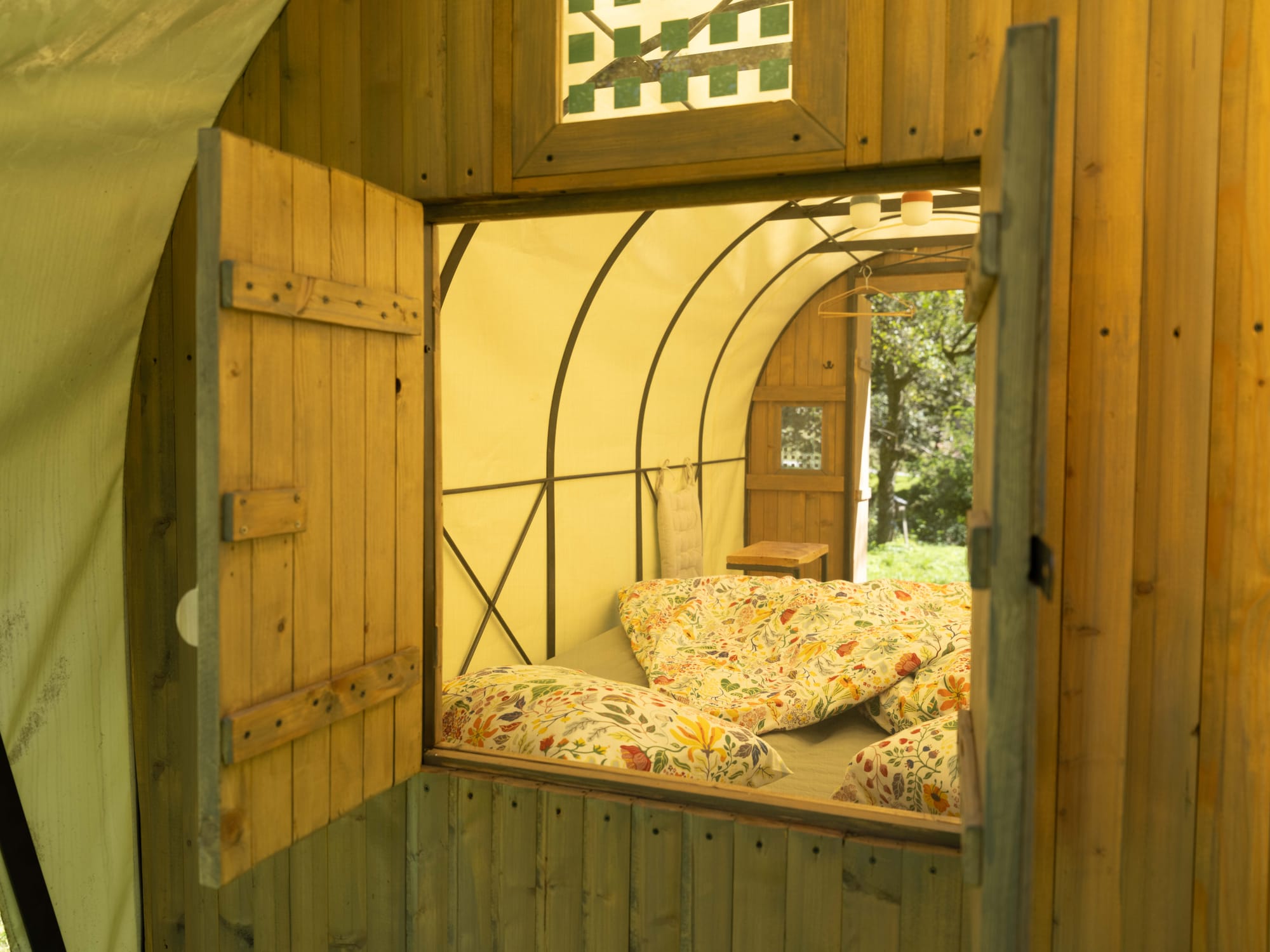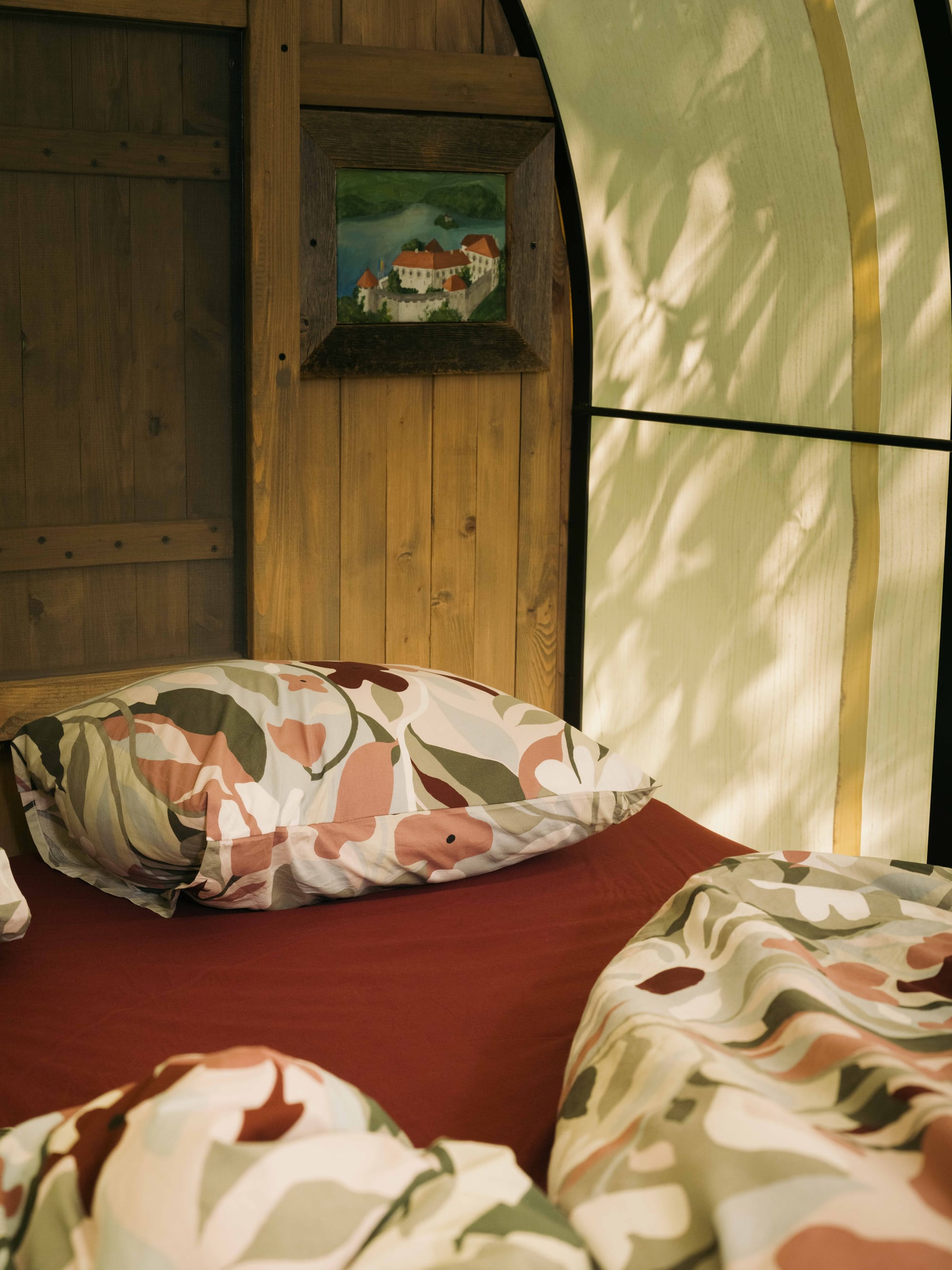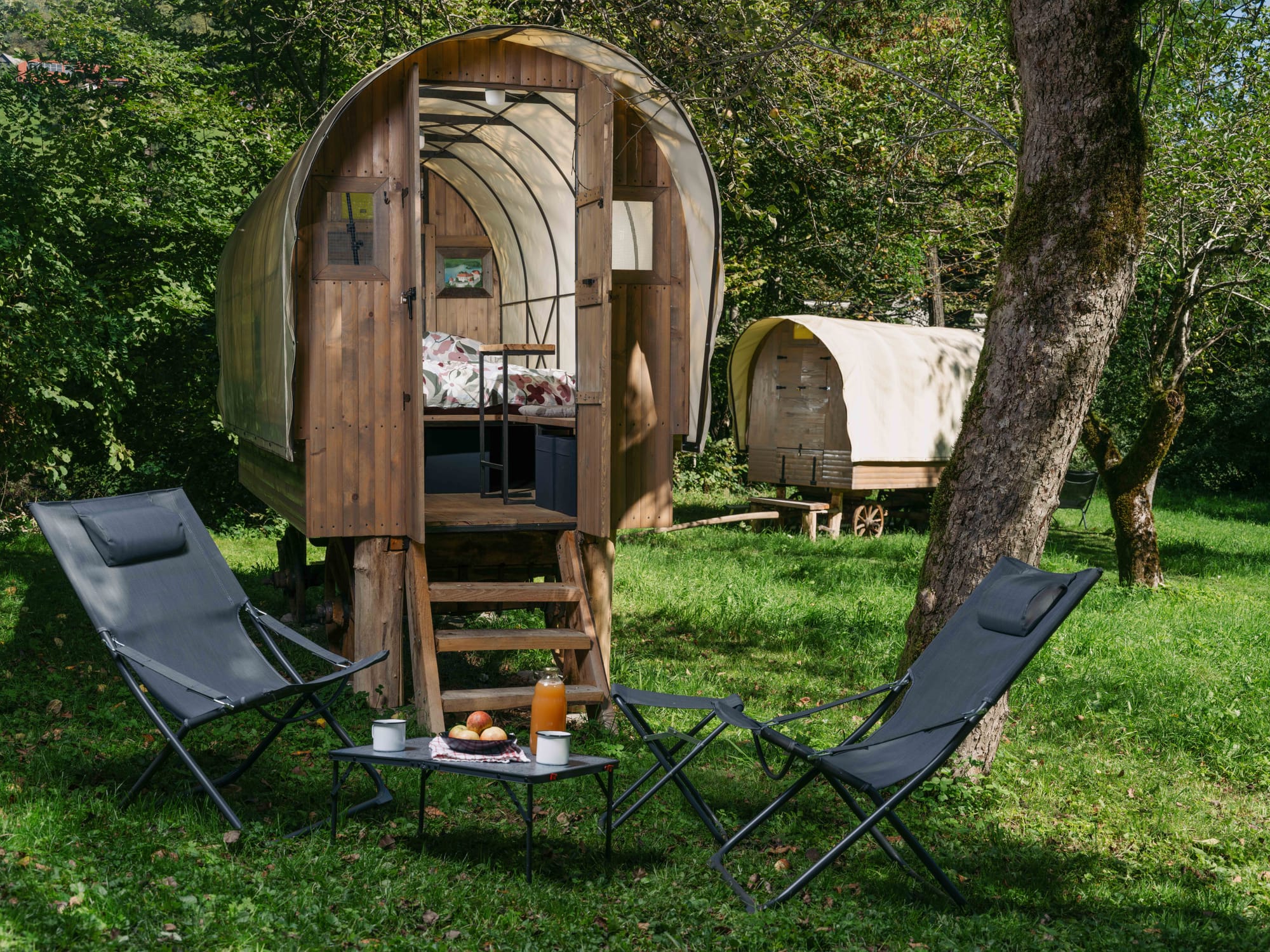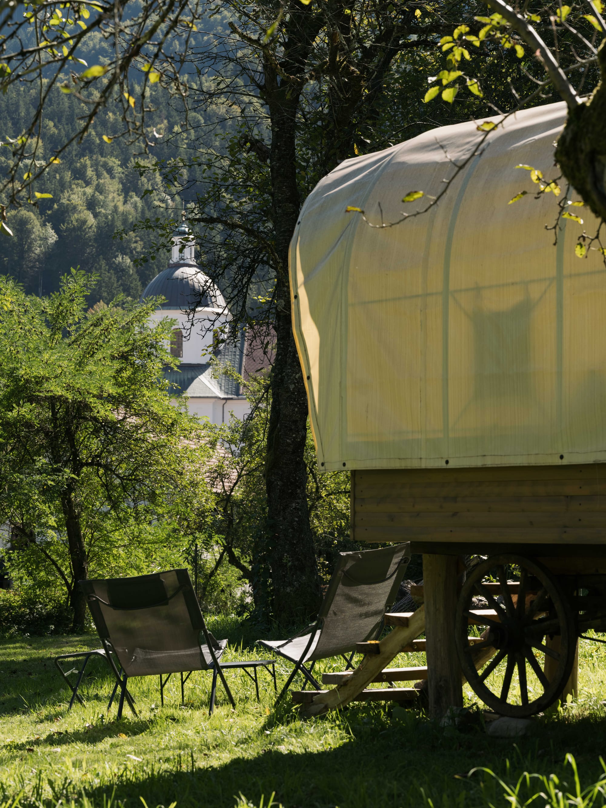 Vsak voz v sadovnjaku ima lastne sanitarije in mini kuhinjo v in ob pritličju 40 m oddaljenega gospodarskega poslopja. Kuhinje so dobro opremljene (hladilnik, dvojni kuhalnik, korito, vsa posoda, pribor...), ob njih je tudi pokrita zunanja jedilnica. Voz ima udobno ležišče za dve osebi, pomični mizici ob sediščih ter dovolj prostora za shranjevanje, dostopnega tudi iz zunanje strani ter zunanjo sedežno garnituro. Najemnik voza lahko ob doplačilu ob njem postavi še svoj manjši šotor za otroke ali prijatelje. Na razgledni točki nad sadovnjakom je leseni podest s kuriščem, ob sadovnjaku pa se vije osvežilni potok. Voza bodo veseli vsi, ki si želijo kampirati, a se nočejo odreči udobju in potovanju brez dodatne opreme za kampiranje. Na voljo je tudi WIFI dostop in brezplačna parkirišča so v neposredni bližini. Each waggon in the orchard has its own toilets and a mini-kitchen in and beside the ground floor of the outbuilding 40 m away. The kitchens are well equipped (refrigerator, double cooker, sink with all cooking/serving equipment). The waggon has a comfortable bed for two people, movable tables next to the seats and enough storage space, also accessible from the outside, as well as outdoor seating. For an additional fee, the renter of the wagon can set up a smaller tent next to it for children or friends. There is a wooden platform with a fireplace at the viewpoint above the orchard, and a refreshing stream meanders by the orchard. Everyone who wants to go camping, but doesn't want to give up comfort and traveling without additional camping equipment, will be satisfied with the comfort of the accommodation. WI-FI access is also available and free parking spaces are nearby.